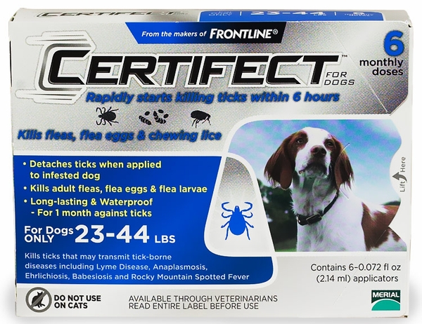 Certifect for Dogs is Merial's new long-lasting, monthly topical flea and tick preventative. It works just like Frontline Plus with the addition of amitraz, a powerful tick-killing ingredient. It kills ticks and adult fleas rapidly and destroys the flea life cycle by killing flea eggs and larvae as well. Most topical tick treatments can take 24-48 hours to kill ticks, but Certifect for Dogs begins killing ticks in 6 hours and kills up to 100% of ticks in 18 hours. Furthermore, it is the only topical tick product that forces ticks to detach from an infested host. Certifect for Dogs provides complete flea control by killing adult fleas and preventing development of all flea stages. It not only kills fleas and ticks rapidly, but it continues to protect dogs from fleas and ticks for a whole month - even when swimming or bathing. In addition, Certifect for Dogs kills chewing lice and can also be used to control chewing lice and sarcoptic mange infestations.